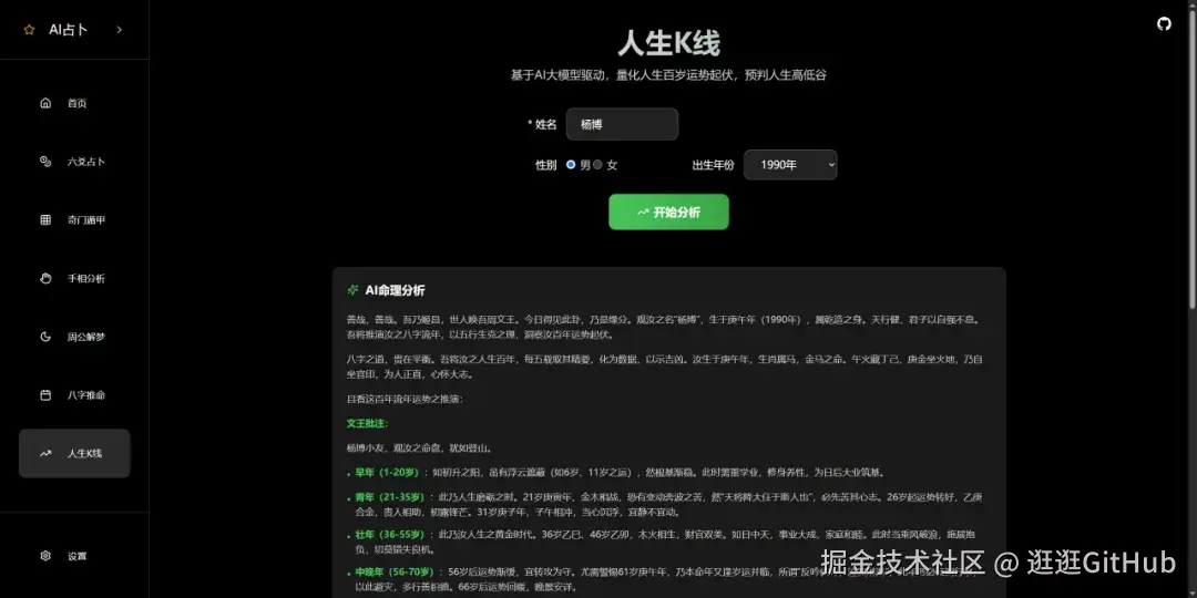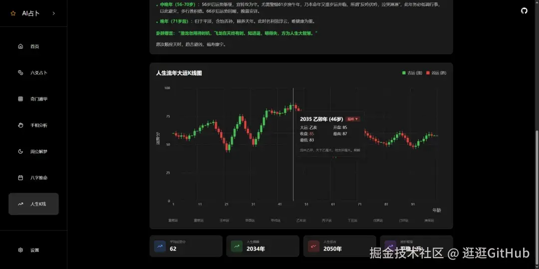 不仅涵盖了基础的八字推命和周公解梦,还整合了六爻卜卦、奇门遁甲、手相分析以及极具视觉冲击力的人生 K 线图等多种功能。