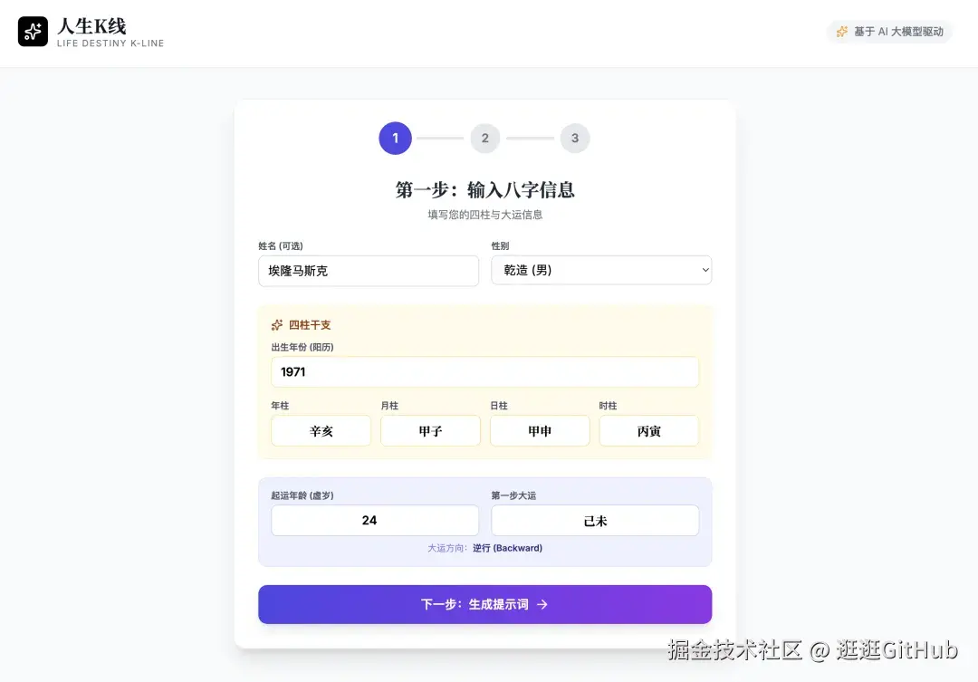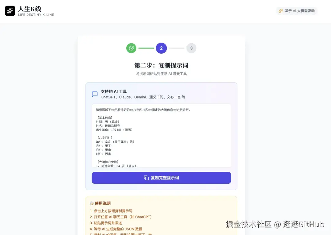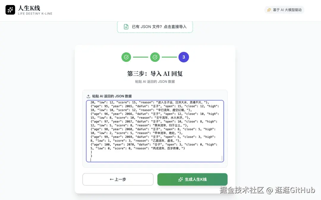 你输入八字,会给你整合一个提示词,提示词丢到 AI 里面,返给你 json 数据。把 json 数据 导入进去,就能可视化了。