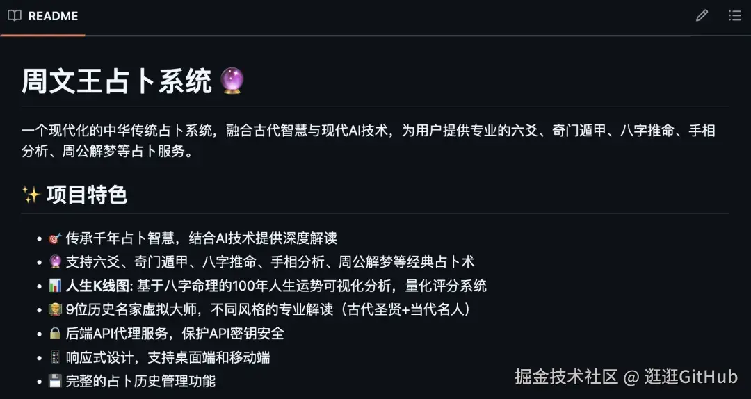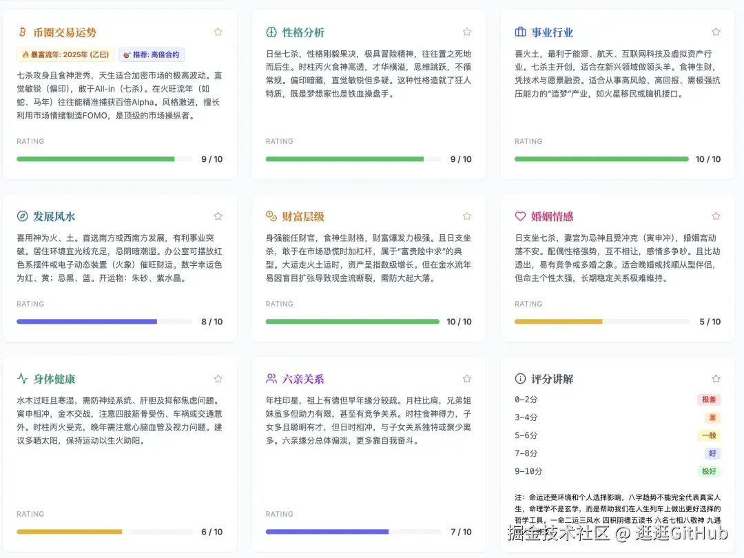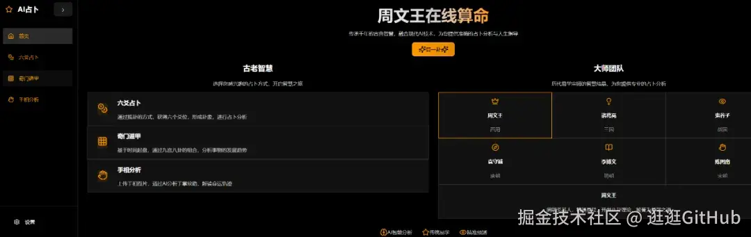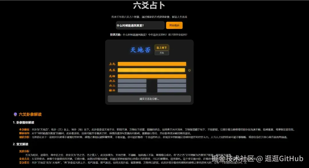 它是一个高度集成的现代化中华传统占卜平台,它将深奥的古代命理智慧与 Gemini 等大模型相结合。