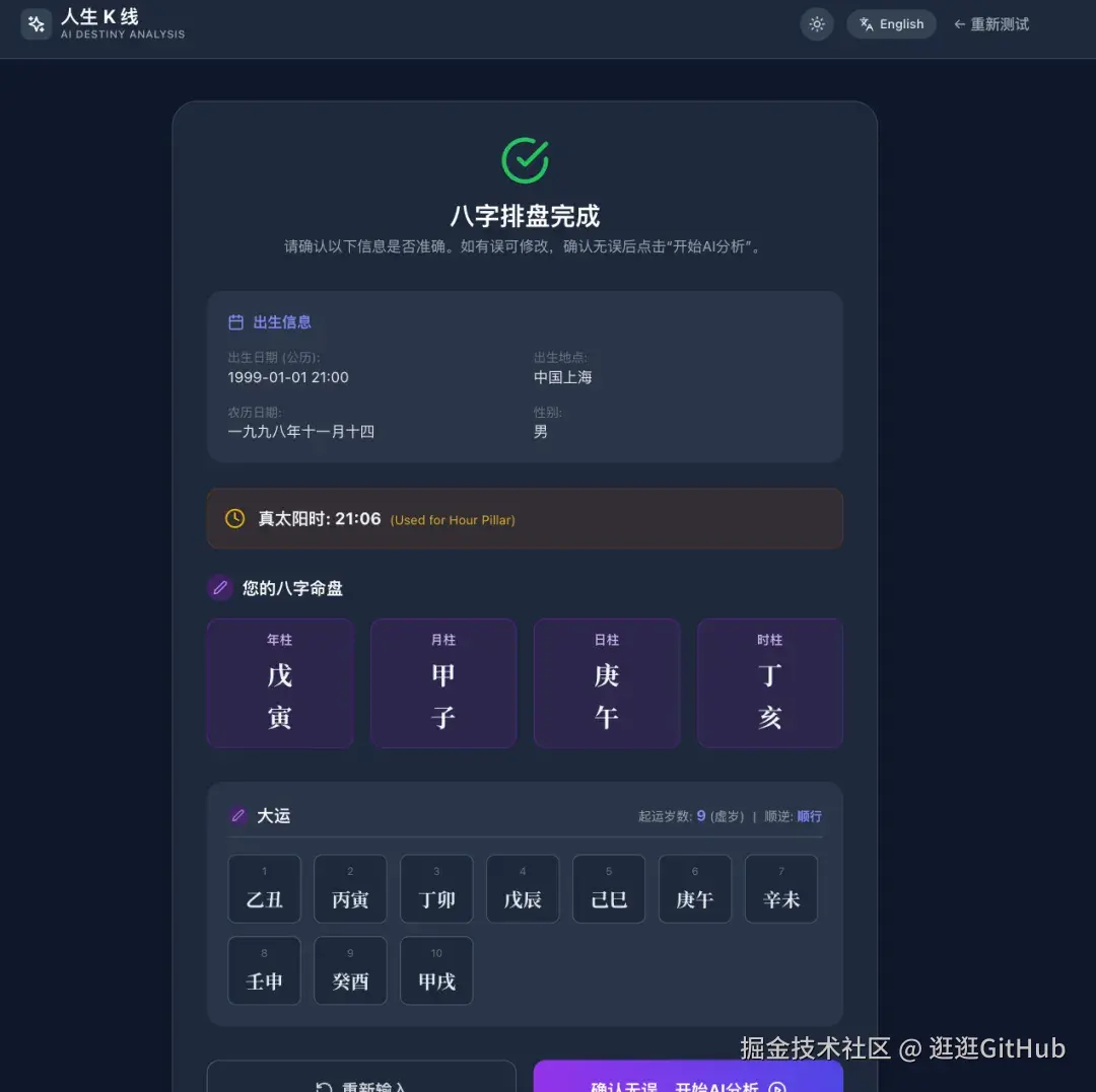 基于 Gemini 3 Pro 和传统八字命理,除了生成个人专属人生 K 线趋势,还带有命理分析、评分和发展建议。