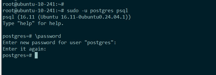 默认情况下是没有设置密码的,在终端下切换至 postgres 系统账户(安装 postgres 的时候自动生成),并运行命令行终端 psql sudo -u postgres psql
