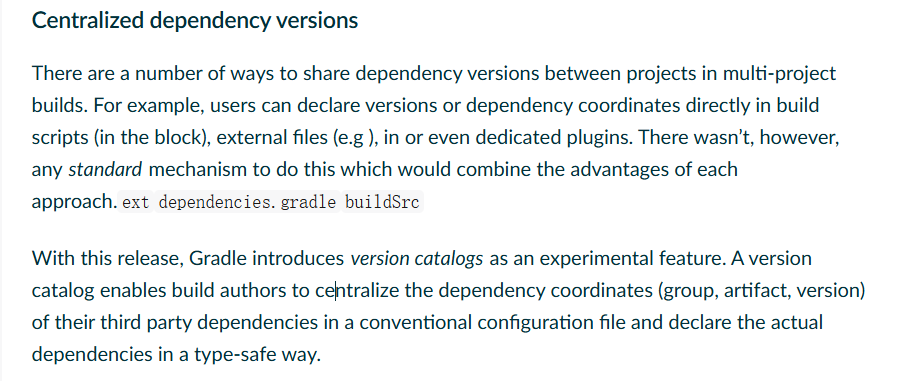 如果需要在组织内部或外部共享版本目录(如公司内部所有项目复用一套依赖版本规范),Gradle 提供了 version-catalog 插件可将版本目录打包为独立组件发布,实现跨项目 / 团队的依赖配置共享。