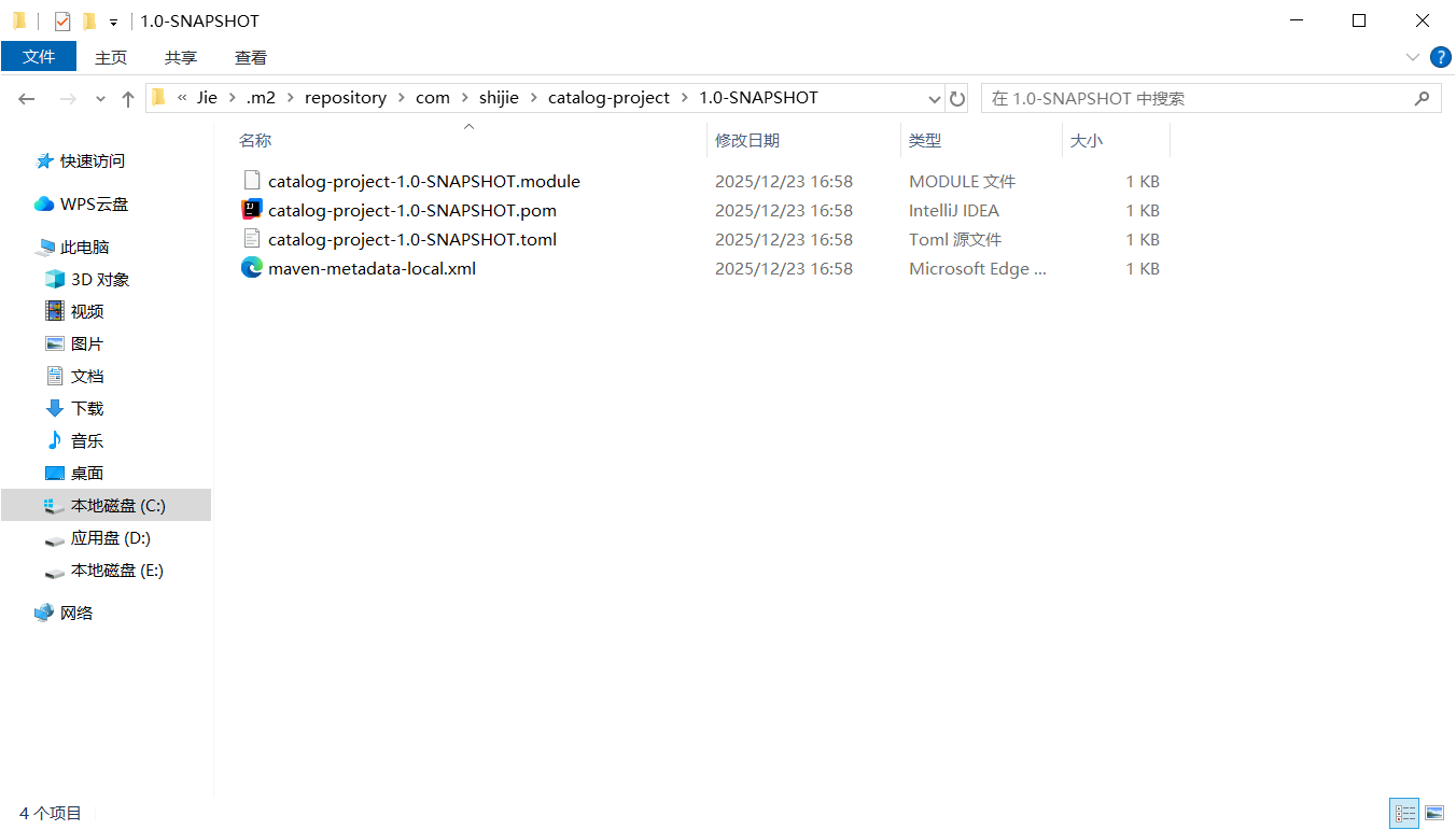 发布成功后,仓库中会生成以下工件(GAV:com.shijie:version-catalog:1.0-SNAPSHOT):