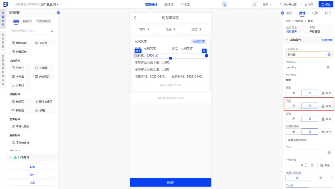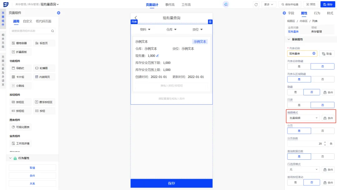 (2)将现有量列表的编辑模式属性设置为"批量编辑",添加保存按钮用于列表数据的保存。