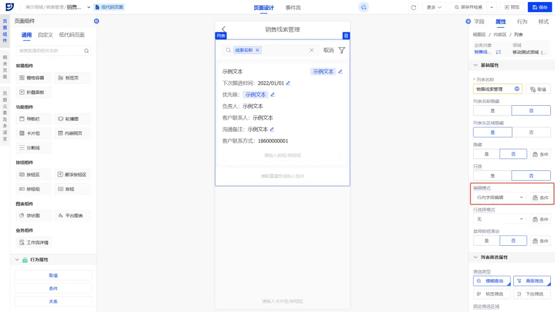 (2)将销售线索列表的编辑模式属性设置为"行内字段编辑"。