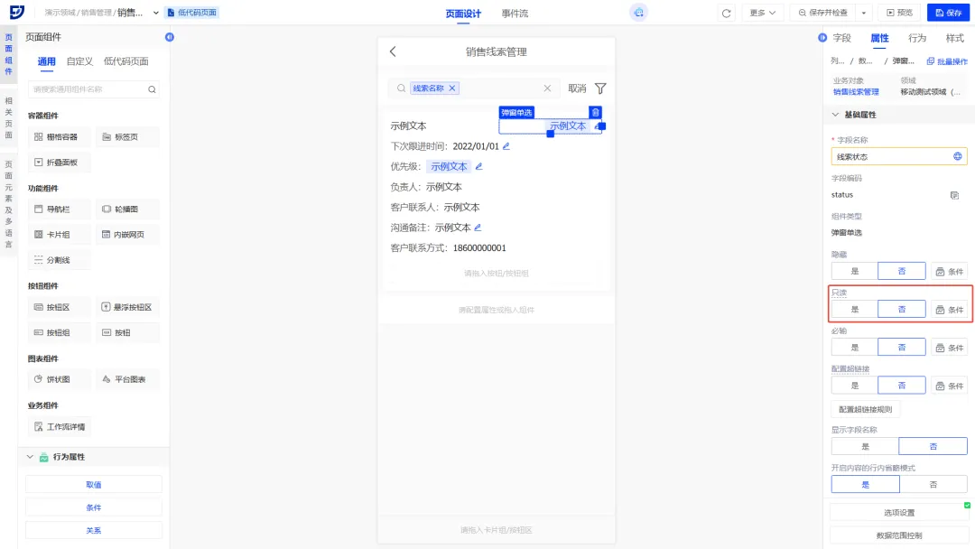 (1)将线索状态、下次跟进时间、优先级、沟通备注字段的只读属性修改为"否"。