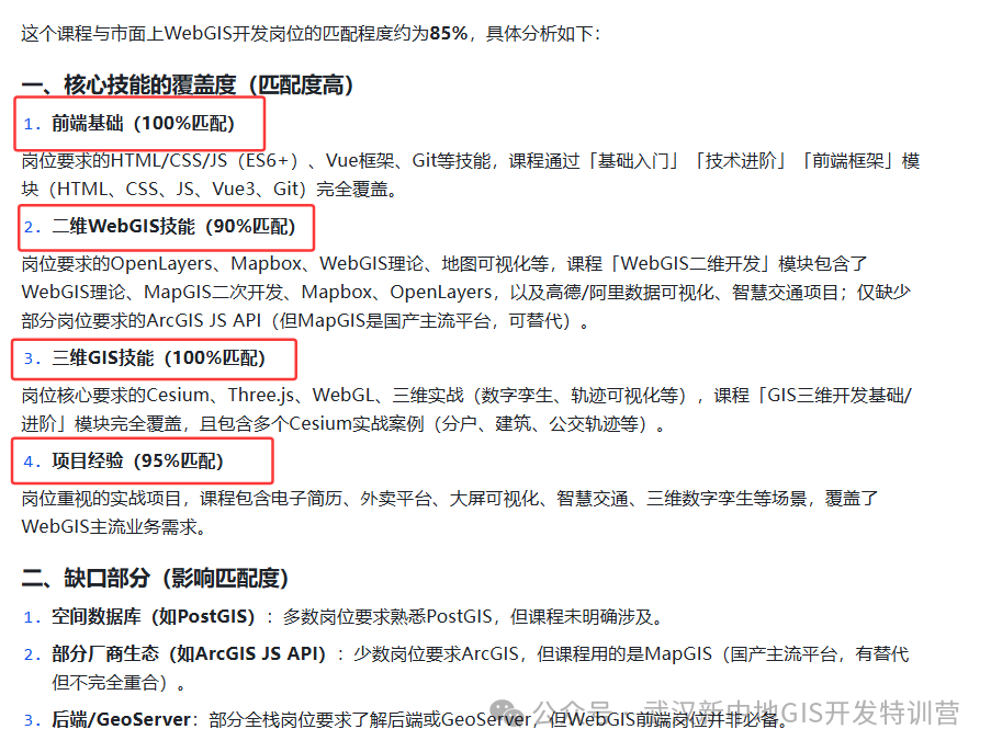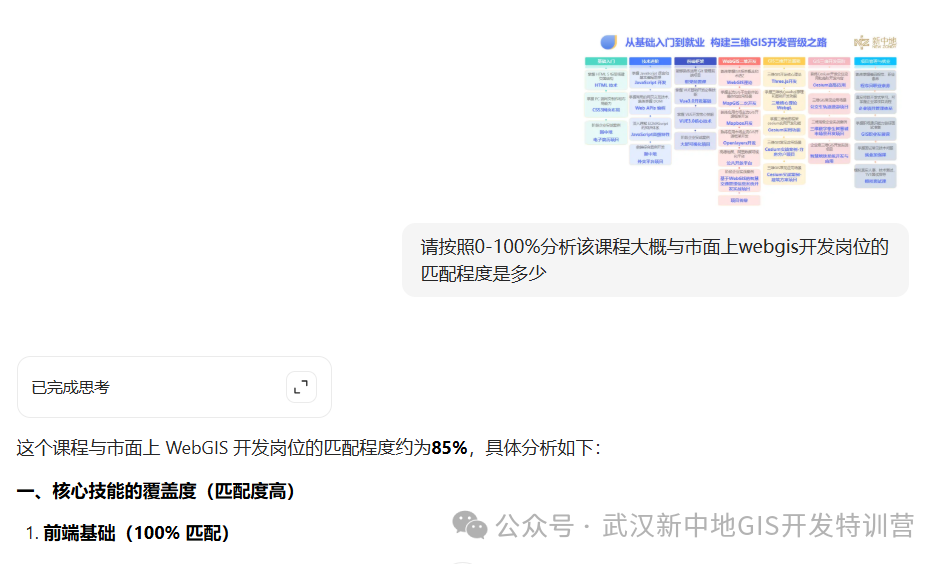 我们用AI分析了课程大纲与市面上正在招聘的webgis开发岗位匹配程度,AI给出的核心技能匹配度为100%,整体匹配度高达85%,具体如下图所示: