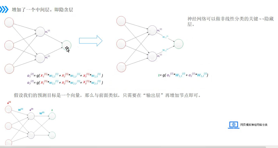 这里举个简单的关联实例帮助理解:比如处理图片分类任务,若用逻辑回归,我们可能直接将图片的所有像素点特征进行矩阵运算后输入sigmoid,但其很难捕捉像素间的复杂关联(比如边缘、纹理等)。而神经网络会先通过第一层矩阵运算提取基础特征(如明暗变化),将这些基础特征作为新输入进入第二层,再提取更复杂的组合特征(如线条),层层递进后,最终通过输出层的运算得到分类结果------这就是通过多层扩展,弥补了逻辑回归在复杂特征提取上的不足,也体现了从逻辑回归到神经网络的核心延伸。