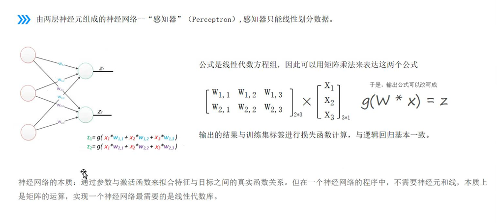 最简单的感知器只能实现线性分类,多层感知器则能够实现非线性的分类,从数学的角度来看,第二层得到的关于x的表达式再次进行矩阵运算就不再是一次幂,也就是非线性的效果。