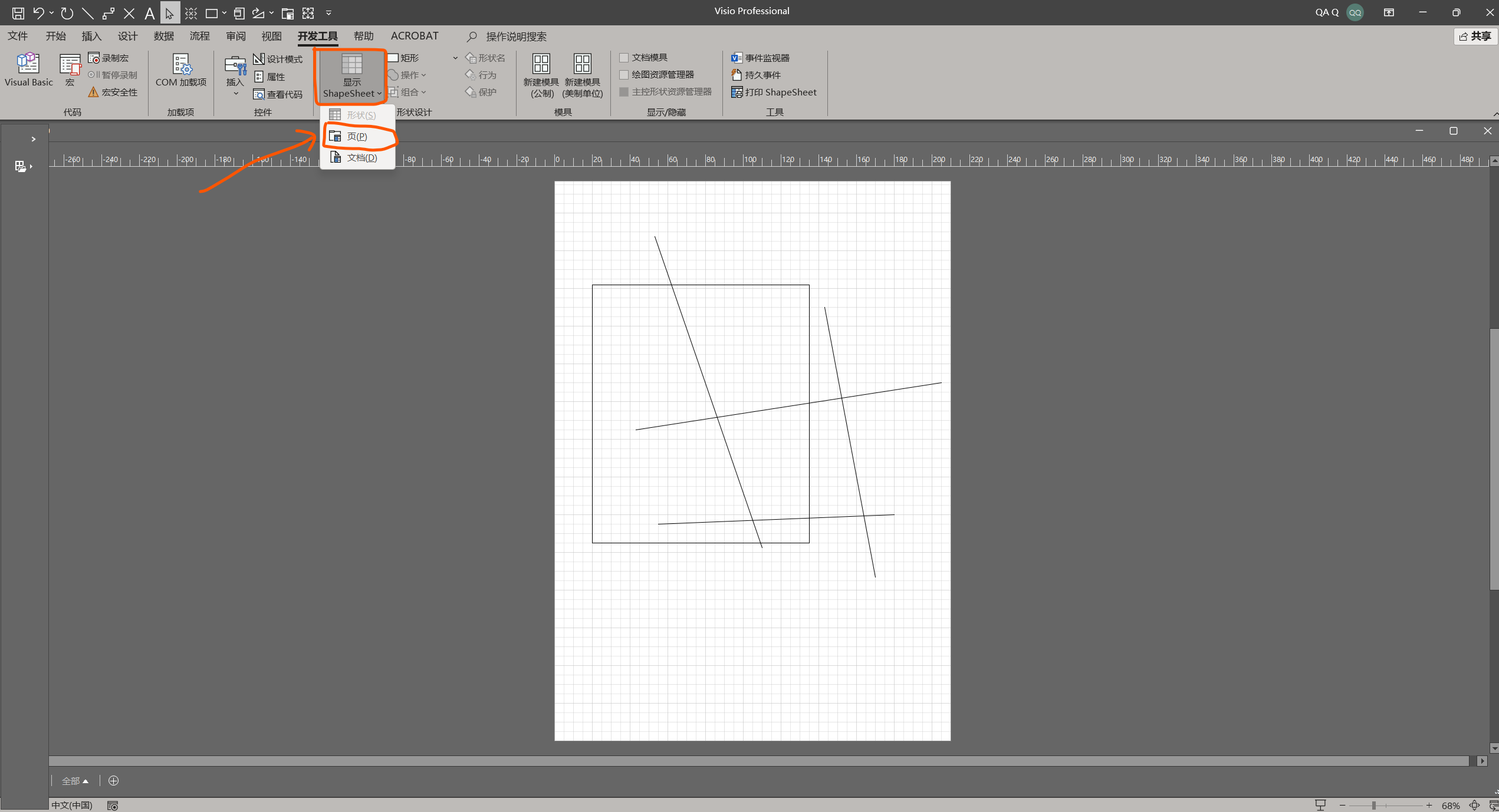 点击【显示ShapeSheet】,点击【页】。