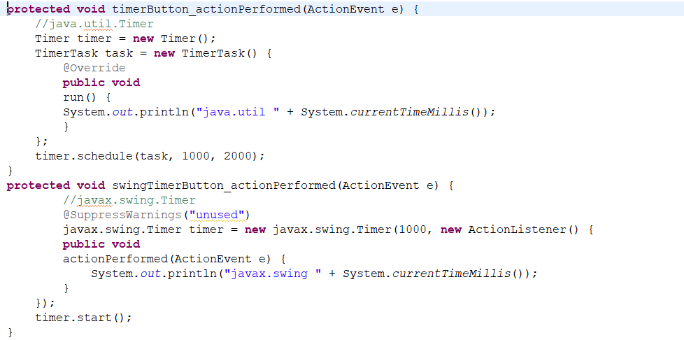 java timer 和 swing timer,一个定周期执行,一个减计数执行,用途稍有区别。new ActionListener是对ActionListener类的实例化,那actionperformed则是对类中方法的override实现,所以写出来就下面的样子了。