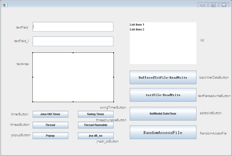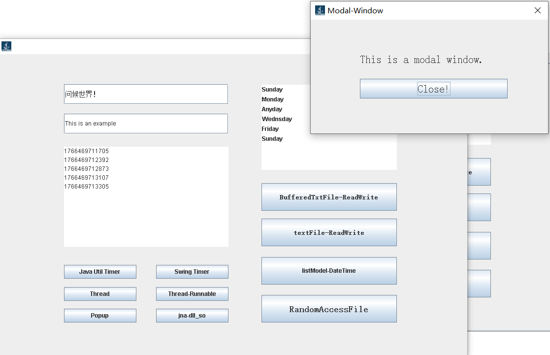 大约是几天的时间,完成了java从0到1的基本功能实践,包括:一个文本框、一个多行文本框、一个LIST框、一个MODAL模态窗口、读写文本文件、读写随机文件、JAVA和SWING定时器任务、多线程类和接口实践、还有一个用JNA实现的调用freebasic的DLL
