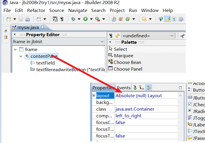 然后就是设计form了,java swing里叫做 jframe,jframe只是个frame,它里面有个contentPane,窗体上的控件都挂在它上面,而不是frame框上。contentPane的layout选Absolute,也是不要布局、任意摆放(几款布局器样式留给以后有时间了再习练)。