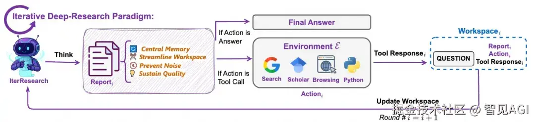 在增量预训练后,通义 DeepResearch 会让模型通过有监督微调 (SFT) 进行"专家示范"训练,快速进入任务状态。此阶段使用合成的高质量问答和轨迹数据,让模型学习规范的思考--行动--观察循环。具体做法是用两种风格的示例训练模型:一是经典的 ReAct 形式("思考→行动→观察"循环),让模型学会结构化答题;二是团队提出的 IterResearch 形式,即在多轮推理时每轮重新聚焦关键内容,避免上下文信息过多造成干扰。可以把 SFT 阶段比作导师带着学生做练习题:模型在"老师示范"下,把之前打好的理论知识用于具体问答和多轮推理场景。通过这样的冷启动,模型迅速掌握从结构化思考到生成连贯行动的能力,为后续自我优化打下良好基础。