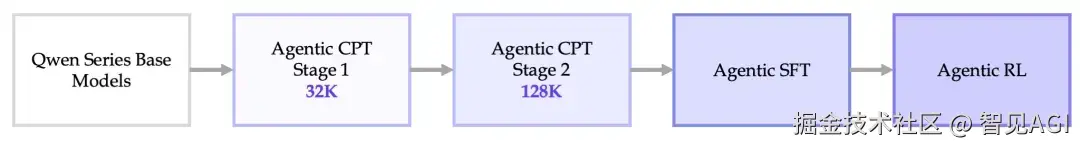 Agentic CPT 相当于给智能体做"扎实的理论学习"。团队首先用合成好的大规模数据对基础语言模型进行增量预训练。在这个阶段,模型并非仅仅背诵静态文本,而是学习一系列模拟"研究过程"的轨迹:比如根据一个查询逐步提取文档信息、调用工具、形成答案。这通过掩码语言建模 的方式,让模型隐式学会规划和工具使用 的技能。在类比上,就像让学徒阅读大量专业书籍和案例解析,同时练习整理信息和提出问题,为后续的实践操作打下坚实基础。Agentic CPT 的创新在于其AgentFounder 数据方案:利用前述数据合成产生的丰富问答对与推理过程,实现了可扩展的大规模训练。