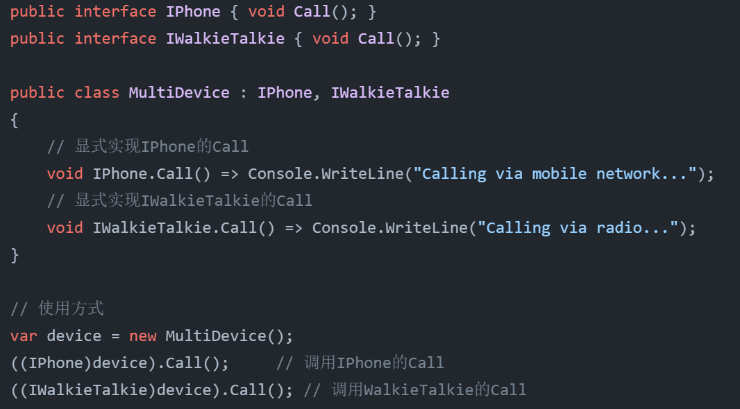 若实现的多个接口包含同名同参方法 ,需通过显式接口实现区分逻辑:
