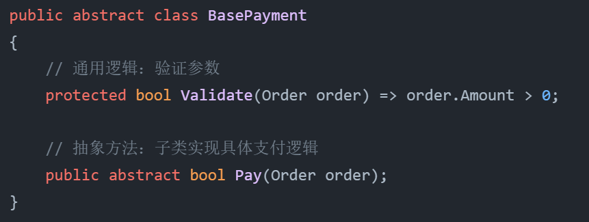 抽象类可以包含通用逻辑,子类仅需实现差异化部分。