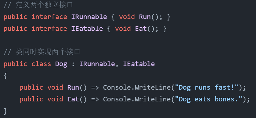 public class Dog : AnimalBase, IRunnable, IEatable)。