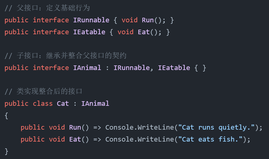 | 契约边界清晰 | 每个接口专注单一职责(如 IRunnable 仅定义"跑"的行为),组合后职责不重叠。 |