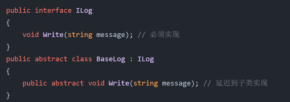 | 成员类型 | 方法、属性、索引器、事件(都不能实现),默认实现方法、静态成员 | 抽象成员:抽象方法、抽象属性、抽象索引器、抽象事件,普通成员:实例字段、普通方法、虚方法/虚属性、静态成员、构造函数 |
