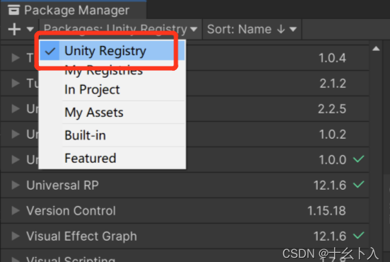 首先打开unity的Window--Package Manager框,左上角选择Unity Registry