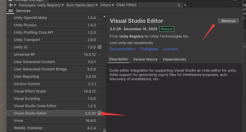 然后在左边Package列表里找到Visual Studio Editor,点击右边面板的install按钮就可以解决了(我这里是安装了所以显示的remove,如果没有安装会显示install)