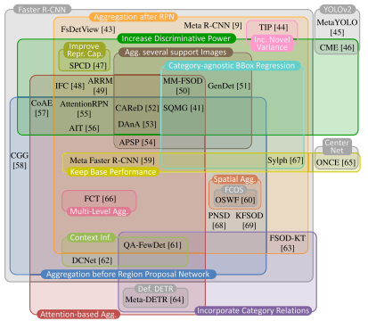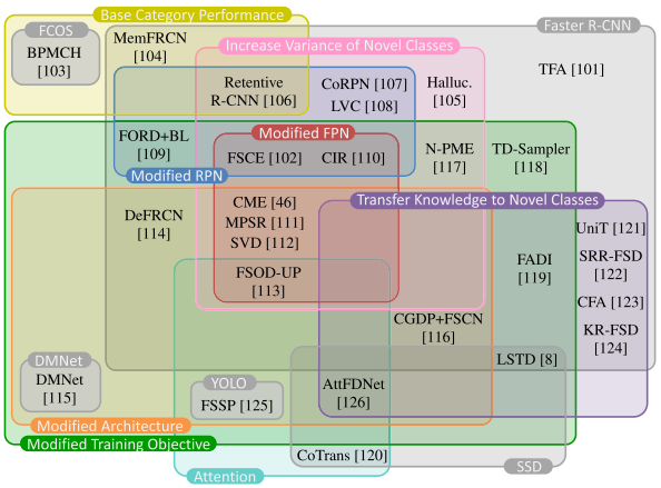 在介绍主要概念后,我们详细阐述了具体方法与一般实现的不同之处,并给出了简短的要点,以突出表现良好的方法的关键见解。基于对最广泛使用的数据集 PASCAL VOC 和 Microsoft COCO 的基准测试结果的分析,我们确定了性能最佳的双分支元学习和迁移学习方法的当前趋势。这两个概念中哪一个更具代表性仍然是一个悬而未决的问题。