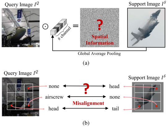 保留空间信息进行聚合:与通过平均池聚合支持特征相反,其他人(见图 4)建议利用空间信息。对于对象检测任务,通过边界框来定位对象。然而,并非该边界框的每个部分都被该对象占据,因此,不包含有关相应类别的相关信息。然而,通过平均池化,这些不相关的特征被聚合到支持向量中。此外,通过全局平均池化,空间信息完全丢失,如图5(a)所示。
