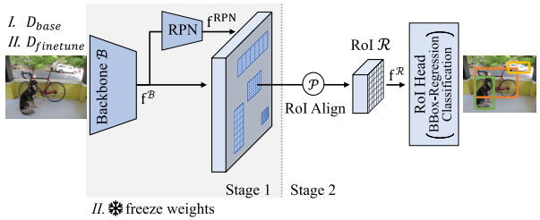 - 基础框架:两阶段训练阶段 1:在 D_base 训练基础模型(冻结骨干网络,仅训练 RoI 头)。阶段 2:用 Dbase∪DnovelD_{base} \cup D_{novel}Dbase∪Dnovel 微调,关键是余弦相似度分类(补偿特征范数差异)。