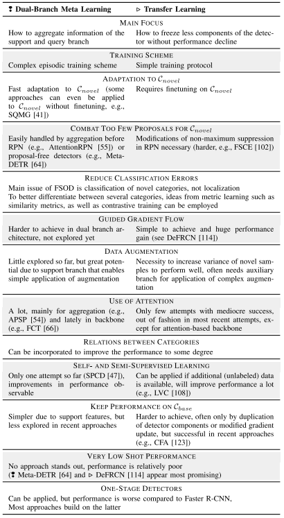 - 许多方法侧重于改进元学习或迁移学习,但往往忽略了两种方法之间的概念是可以互换的,如表一所示,这为未来的工作留下了改进的潜力。由于主要使用的 FSOD 基准 PASCAL VOC 和 Microsoft COCO 不包含代表稀有物体的现实新颖类别,因此我们希望鼓励未来的研究对 LVIS 或 FSOD 等更现实的数据集进行额外评估,正如中已经完成的那样。此外,提供了用于创建定制FSOD数据集的框架。当在现实环境中使用 FSOD 时,包括非常罕见的类别,很可能会发生域转移。因此,跨域检测的概念应该在未来的工作中进一步探索。