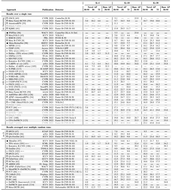 在表 II 中,我们列出了 PASCAL VOC 数据集所描述方法的基准结果。我们根据 Wang 等人 提出的结果是针对单次运行给出的结果还是对多次运行的平均值来划分表格。为两种评估协议提供结果的方法都标有"←−",作为比较的锚点。两种评估协议之间的性能差距不可忽略,并且表明平均结果更可靠 。此外,我们还指出是否需要对 DnovelD_{novel}Dnovel 进行微调,或者是否通过简单的元测试即可获得结果。每种方法的前面都有一个小符号。一般来说,迁移学习和双分支元学习方法都可以取得相似的结果。第 V 节的双分支元学习和第 VI-D 节的迁移学习的末尾总结了最佳表现方法的主要特征。