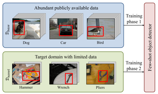 图 1.总体思路:通过首先在具有丰富注释边界框的基础数据集上进行训练,可以将少样本对象检测器应用于仅具有很少注释对象实例的设置,例如机械工具。