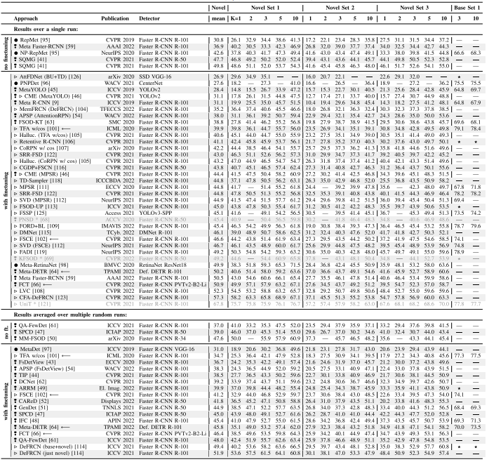 表 II AP50 公布的所有三组和不同样本数 K 的帕斯卡 VOC 基准结果。我们按照所有新颖组和镜头的平均值对方法进行排序。 ---:没有纸质报告结果。 ⋆:仅报告不同镜头或组数的结果,因此,此处不包含这些结果。 *:偏离评估协议,妨碍公平比较,如第 IX-C 节所述。 ❢:双分支元学习。 •:单分支元学习。 ▷:迁移学习