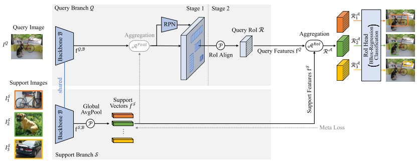 图 3. 基于 Faster R-CNN 的双分支元学习的总体架构。查询和支持图像通过共享主干网提供。支持特征通过全局平均来汇集并与查询特征聚合。不失一般性,我们在这里展示一次三路的情况。
