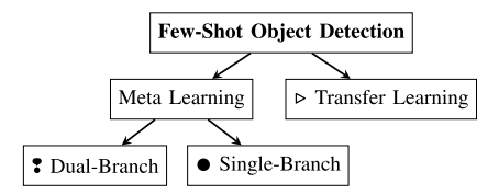 我们将 FSOD 方法分为元学习和迁移学习方法,如图 2 所示。我们进一步将元学习方法分为单分支和双分支架构。双分支架构由查询和支持网络分支构成,即网络分别处理两个输入(查询和支持图像)。单分支方法通常类似于通用检测器的架构,但在新类别训练或利用度量学习时减少了可学习参数的数量。