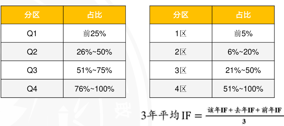 主要有两种分区标准:科睿唯安JCR分区(Q1~Q4),中科院JCR分区(1区~4区)。两种标准都是基于期刊的IF将SCI期刊分为4个区,只是IF划分区间的标准不同。