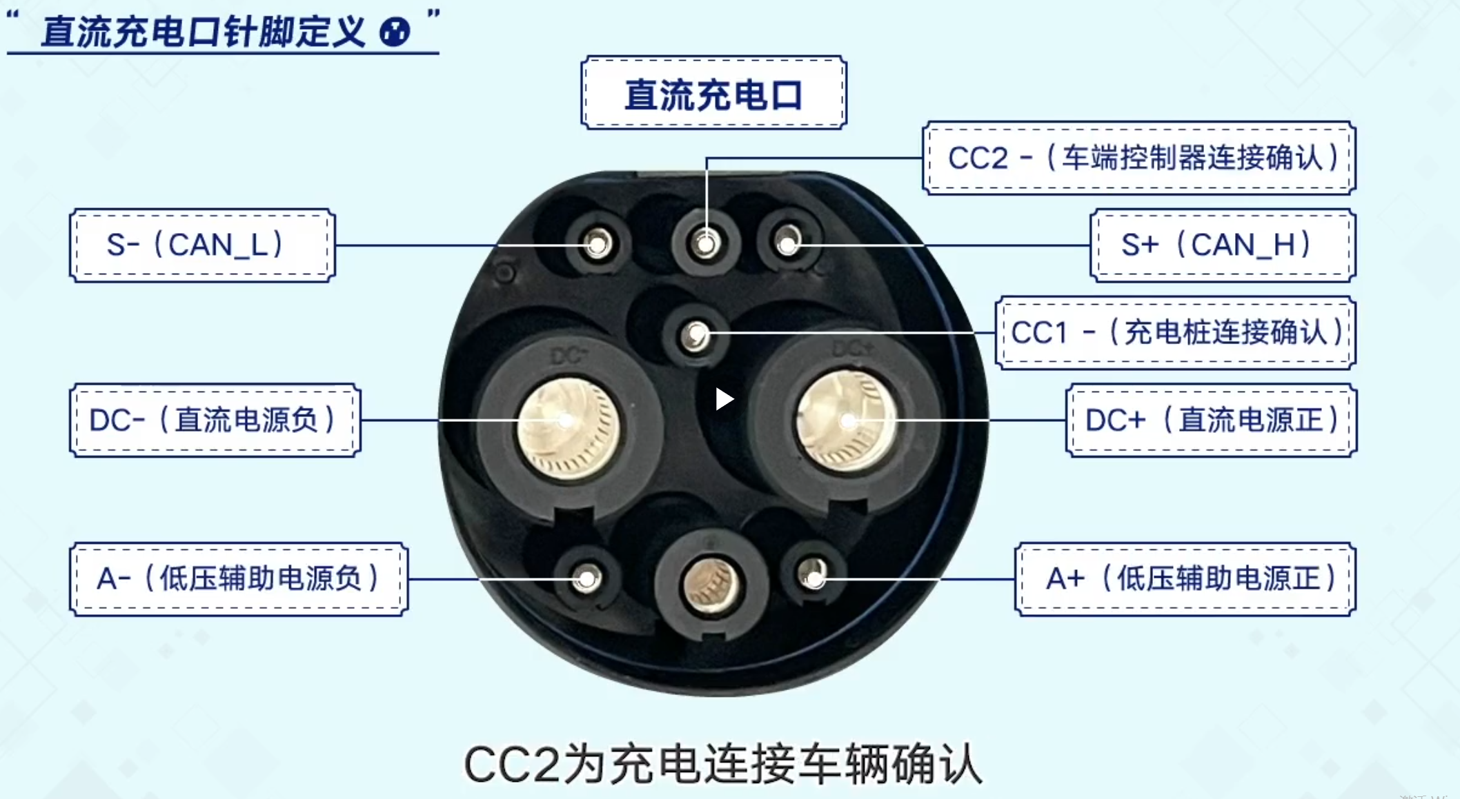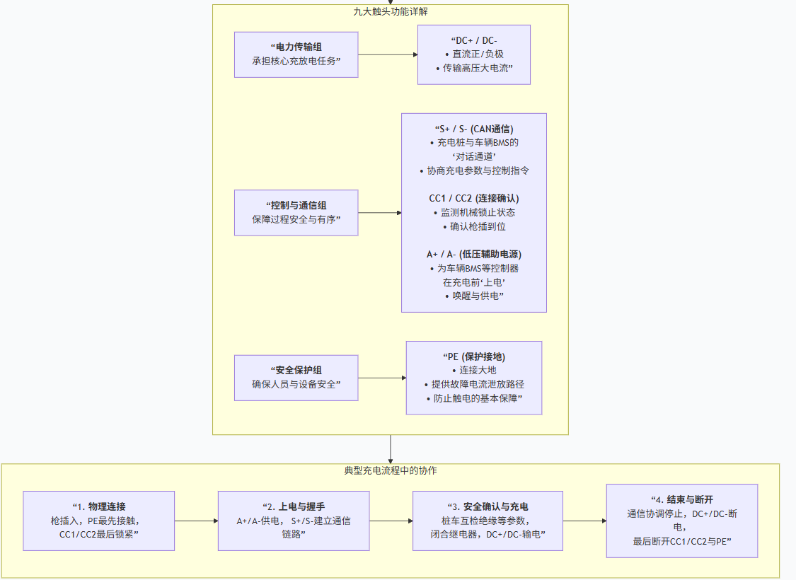 充电枪共 9 个触头,分别对应直流正(DC+)、直流负(DC-)、保护接地(PE)、CAN 通信(S+/S-)、连接确认(CC1/CC2)、低压辅助电源(A+/A-)