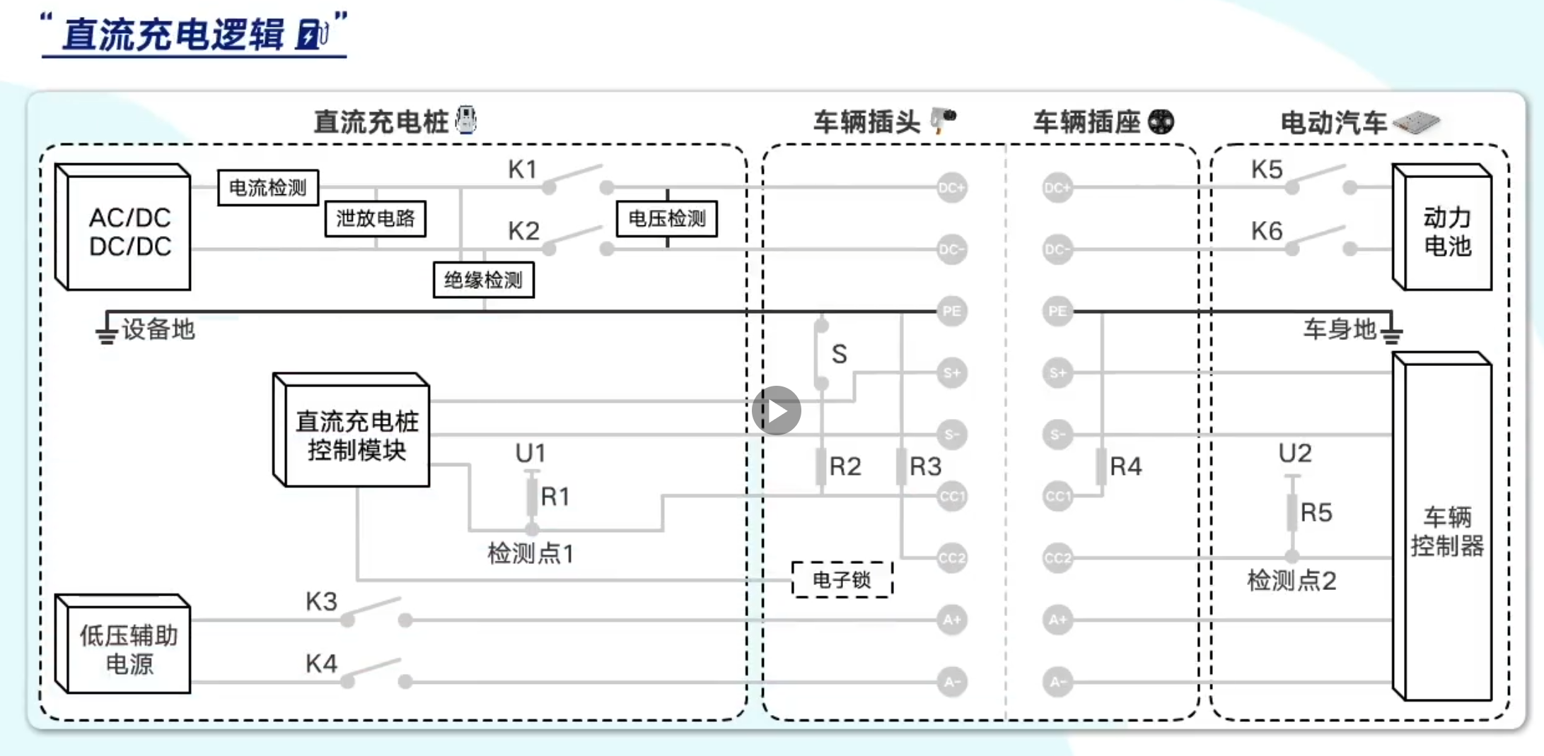插枪锁未松开:充电机 CC1(R1) ↔ 充电枪 CC 线 ↔ 车辆 CC1(R4),此时检测点 1 电压 = 低压电源电压 × R4/(R1+R4);