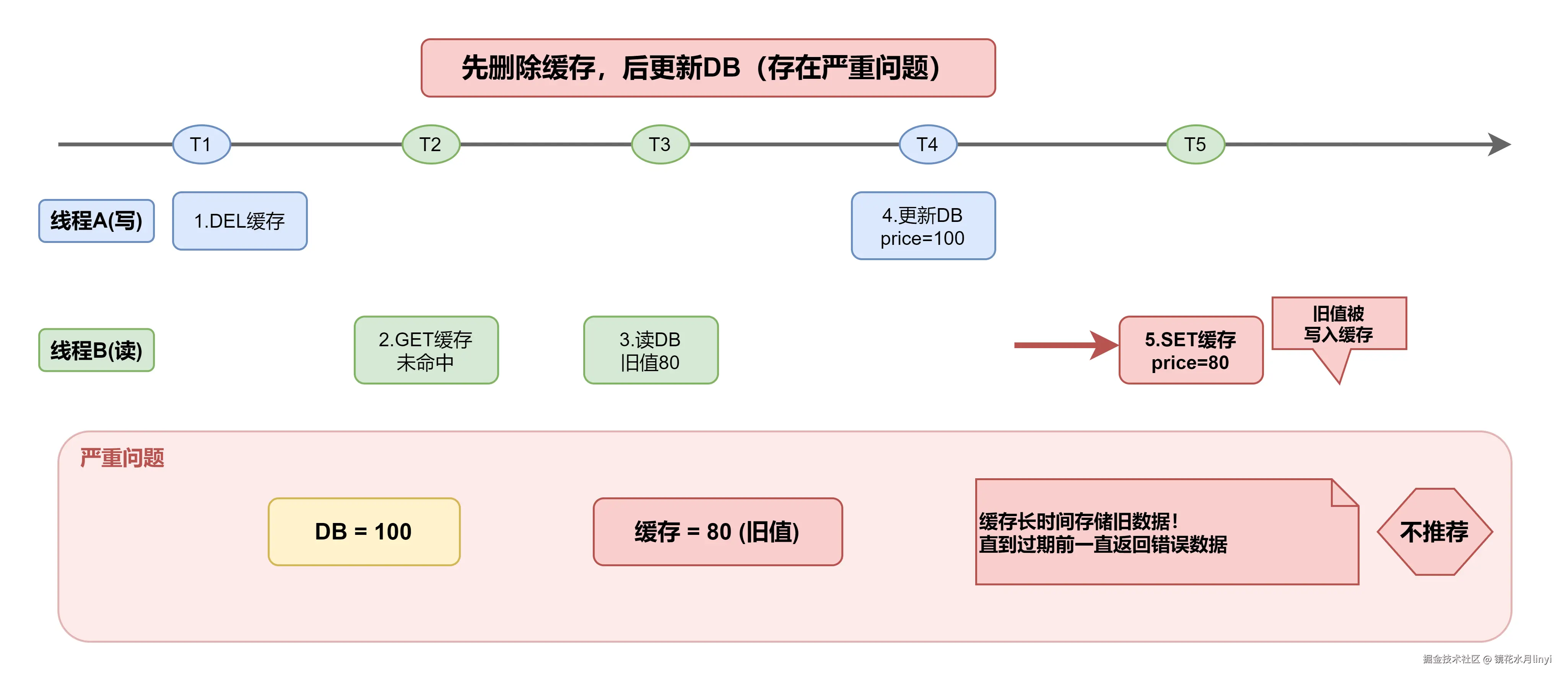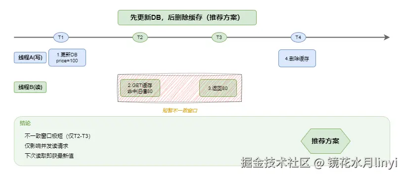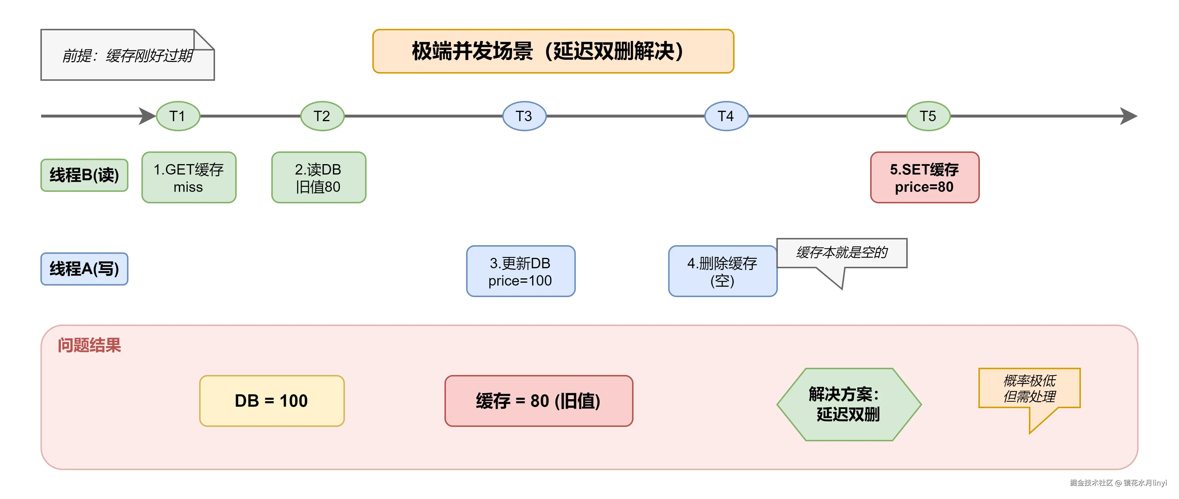 | 读写并发冲突 | 读线程回填旧值覆盖新值 | 中 | 需缓存miss+特定时序,罕见 |
