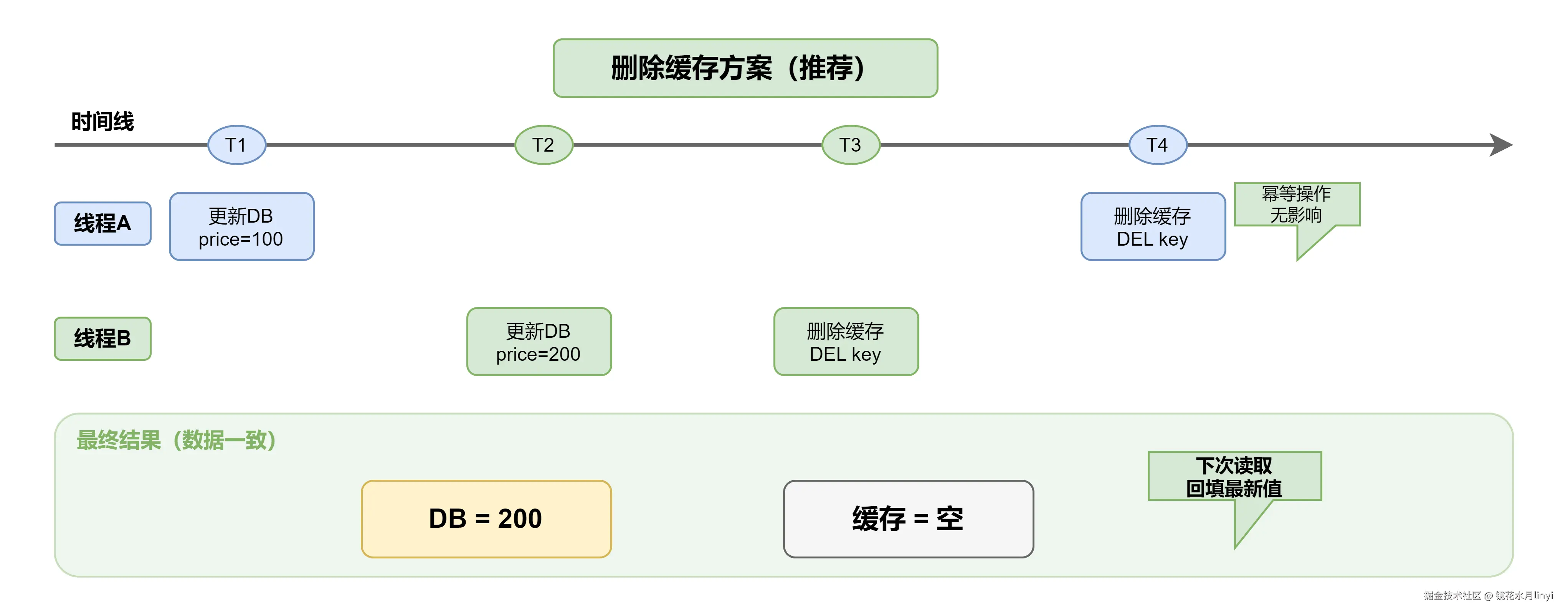 这是缓存一致性最核心的章节,我们来深入分析几个关键问题:为什么删除而不是更新?为什么先更新DB后删缓存?这些问题的答案直接决定了系统的数据一致性。