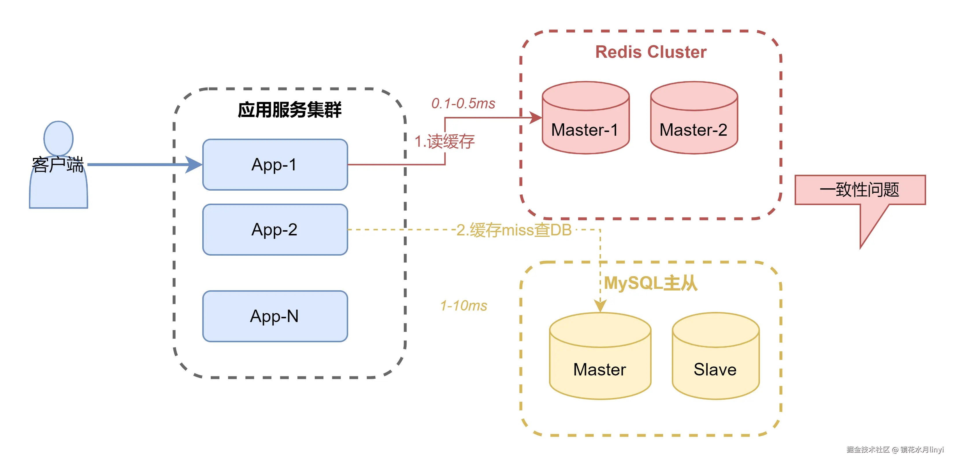 | Cache Aside | 先读缓存,miss则读DB并回填 | 先更新DB,再删除缓存 | 最终一致 | 低 | 通用场景(推荐) |