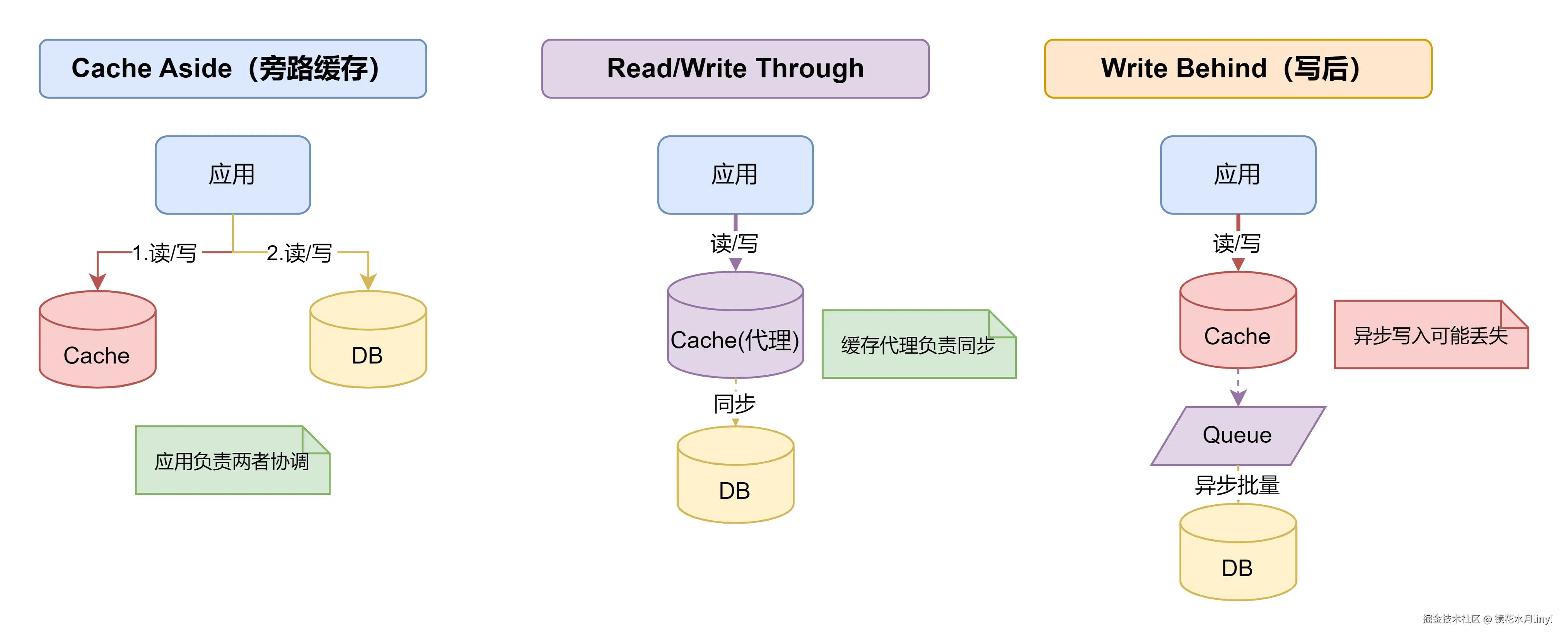 业界主流的缓存读写策略有三种,它们在一致性、性能、复杂度之间做出不同的权衡。理解这三种策略的本质区别,是选择合适方案的前提。