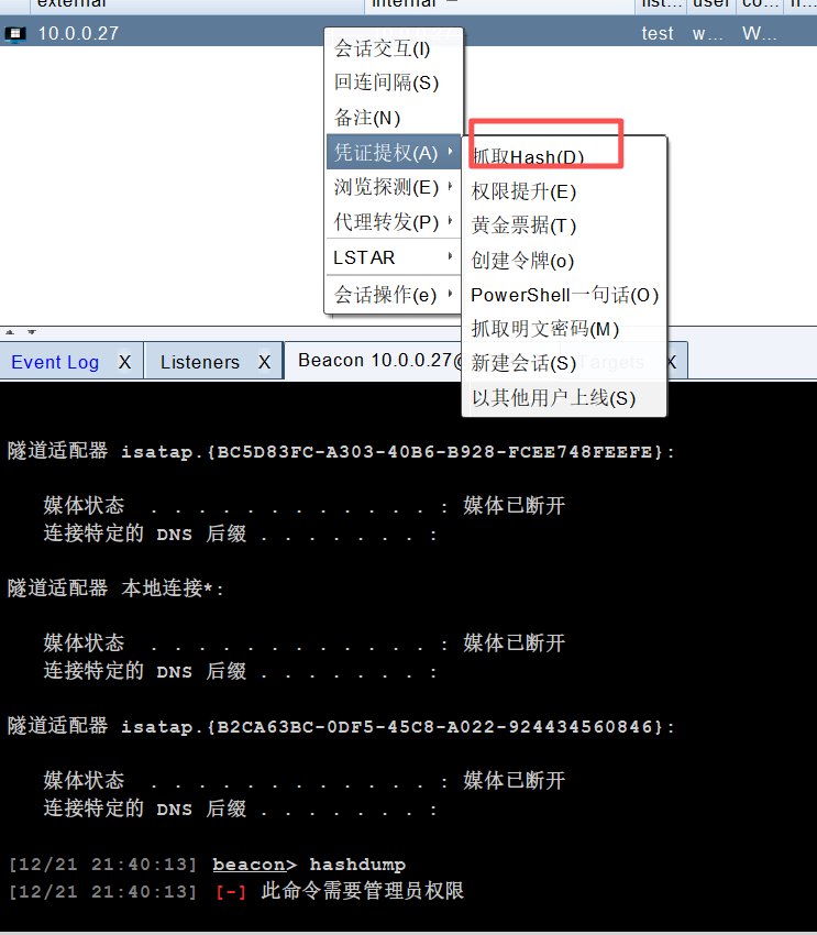 提权之后再获取密码和哈希值 可在"凭据信息"中看到在当前主机上登录过的账号密码和哈希值。
