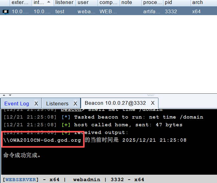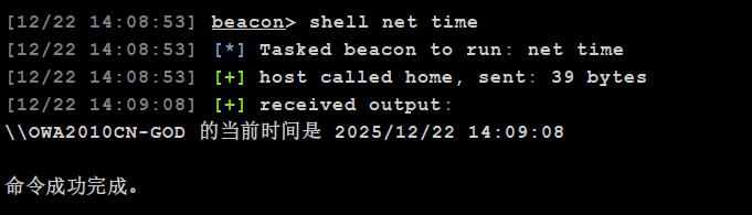 进入beacon,输入命令判断是否为域环境:shell net time /domain