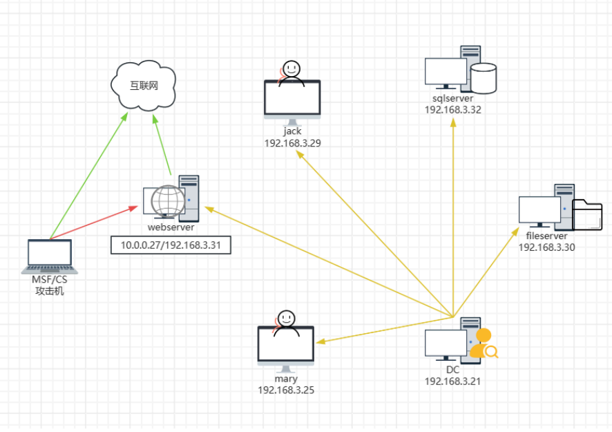 网络结构解读:webserver是唯一对外服务的主机,整个域内环境中只有他能够访问外网,其他主机全部无法访问外网,只能实现域内通信,同时域内的所有机器都受到域控(DC)的管理。